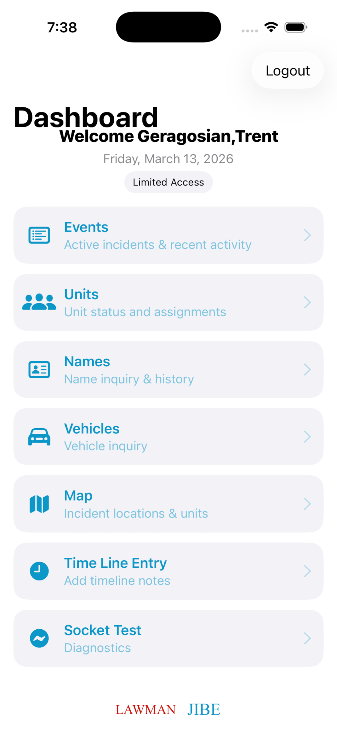 LAWMAN JIBE provides law‑enforcement officers with immediate access to the information they need most in the field, strengthening both operational efficiency and officer safety. By combining real‑time incident data, live officer location awareness, and rapid access to critical details on suspects and victims, the platform becomes a centralized intelligence hub that supports faster decision‑making and more coordinated responses. Designed for high‑pressure environments, it delivers clear, actionable insights that help officers stay informed, connected, and prepared during every call for service.